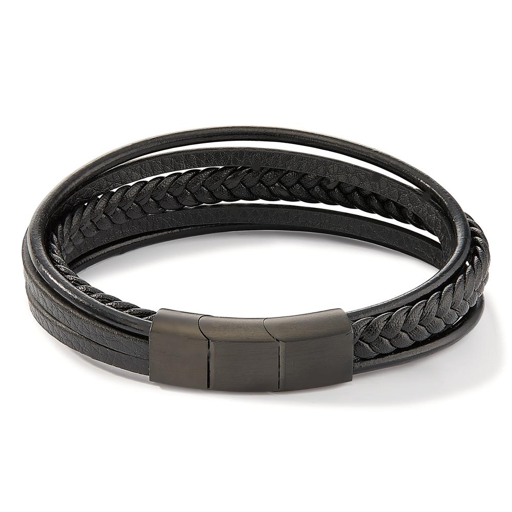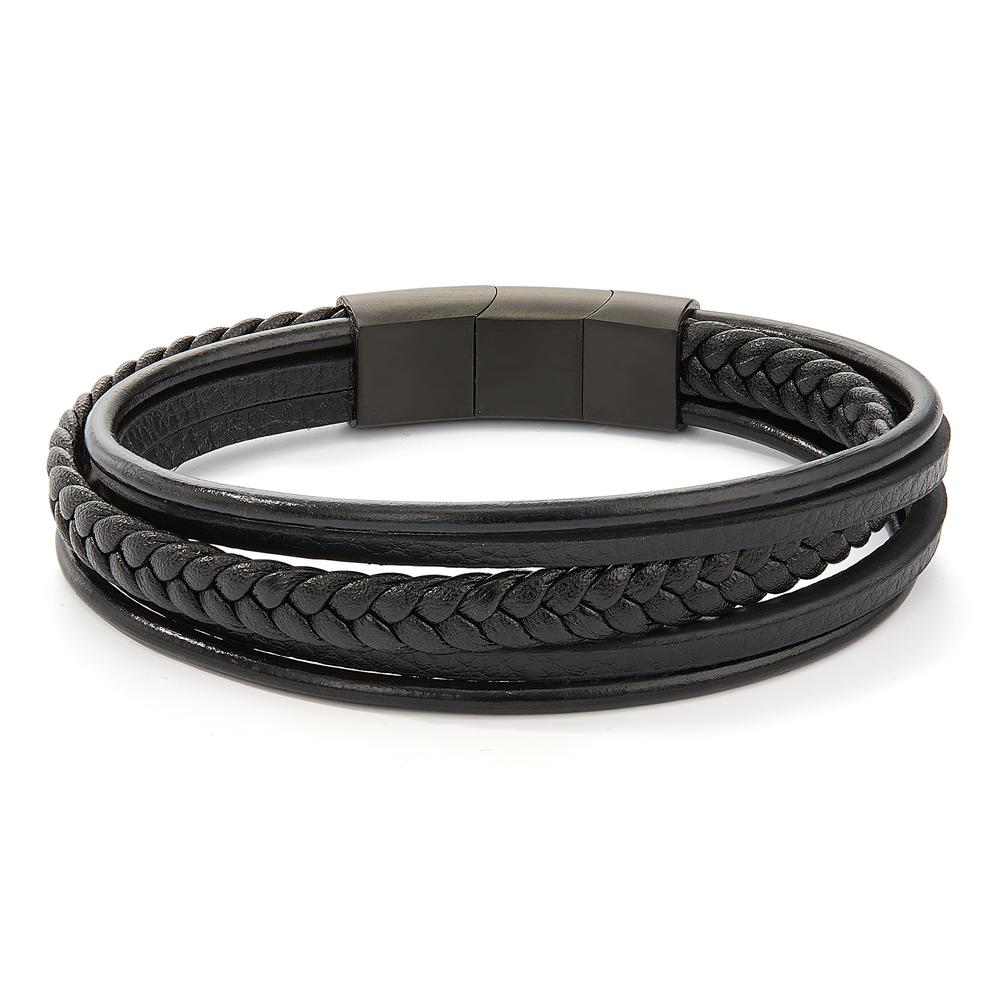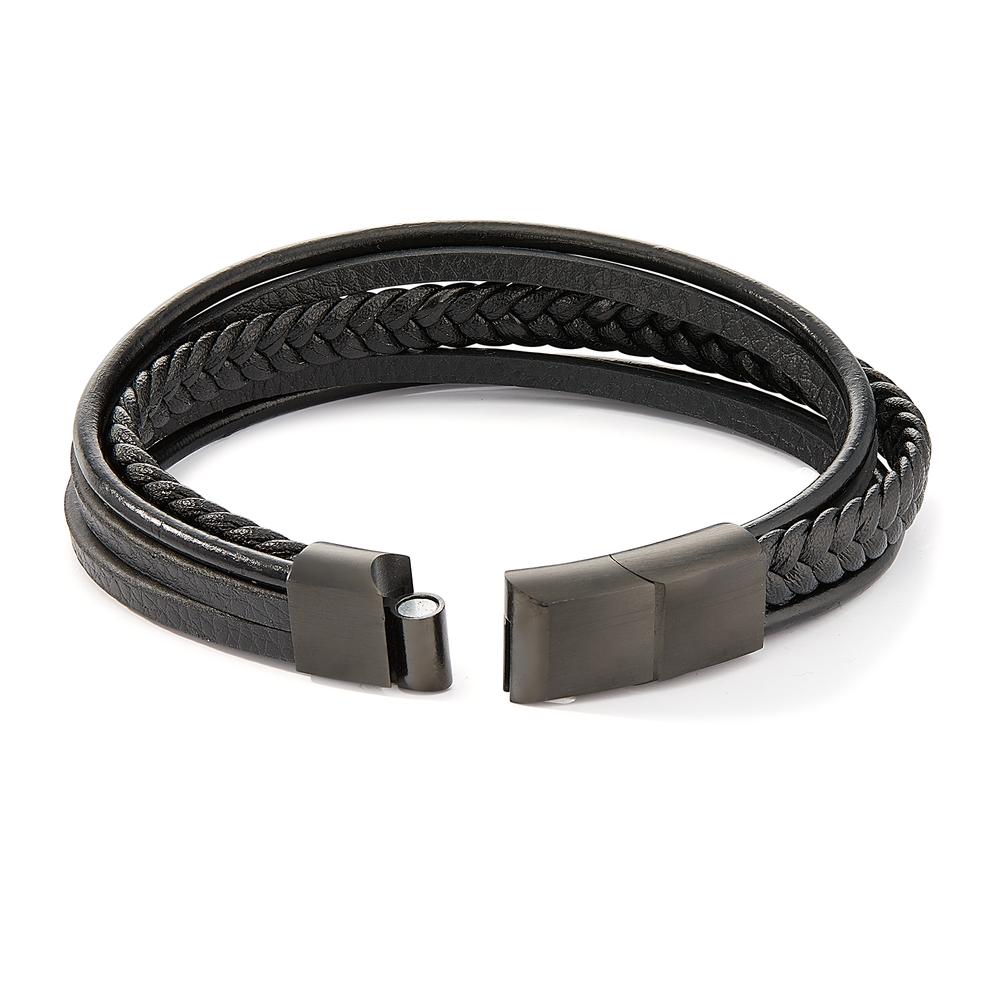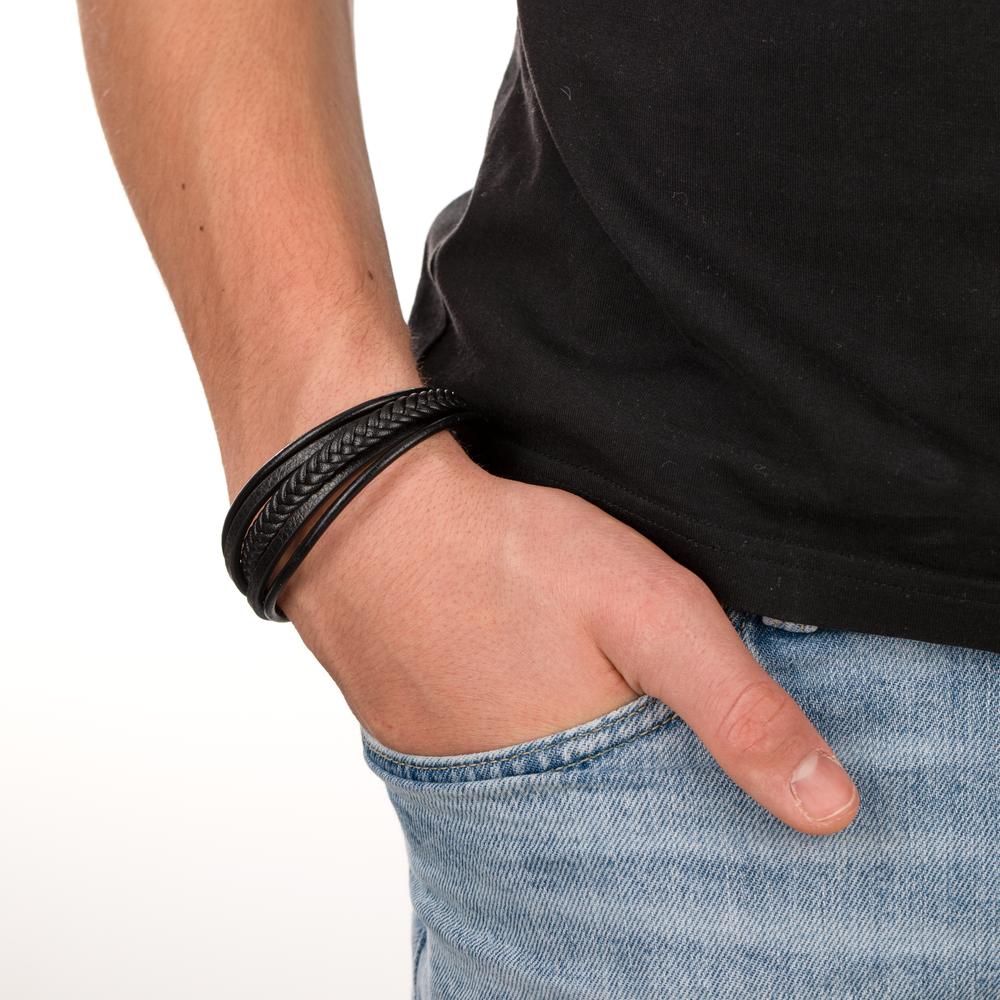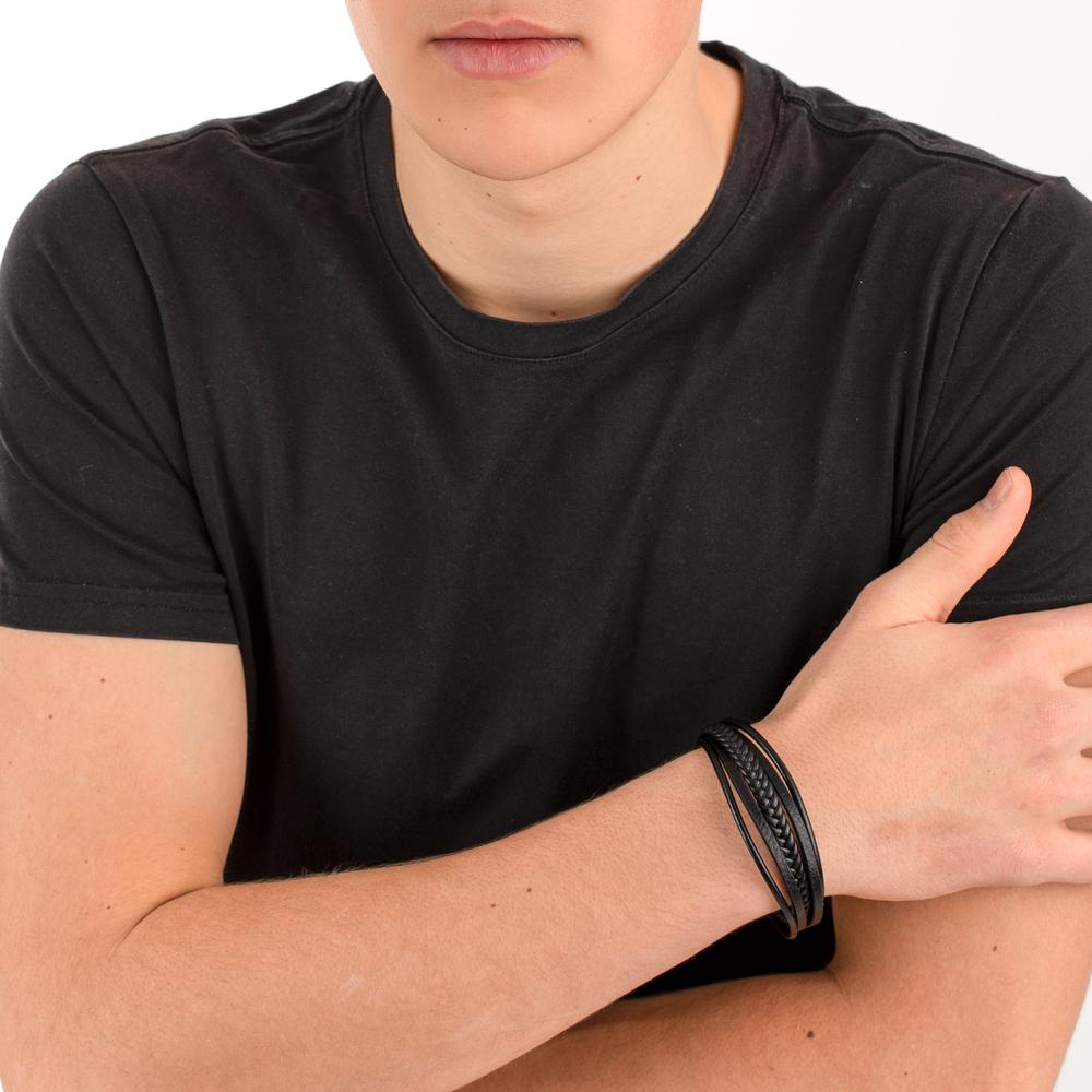 This men's bracelet combines stylish black faux leather with a sleek stainless steel clasp for a modern, versatile look. Featuring braided and smooth textures, it adds a bold yet refined touch to any outfit. Durable and comfortable, perfect for everyday wear or special occasions.