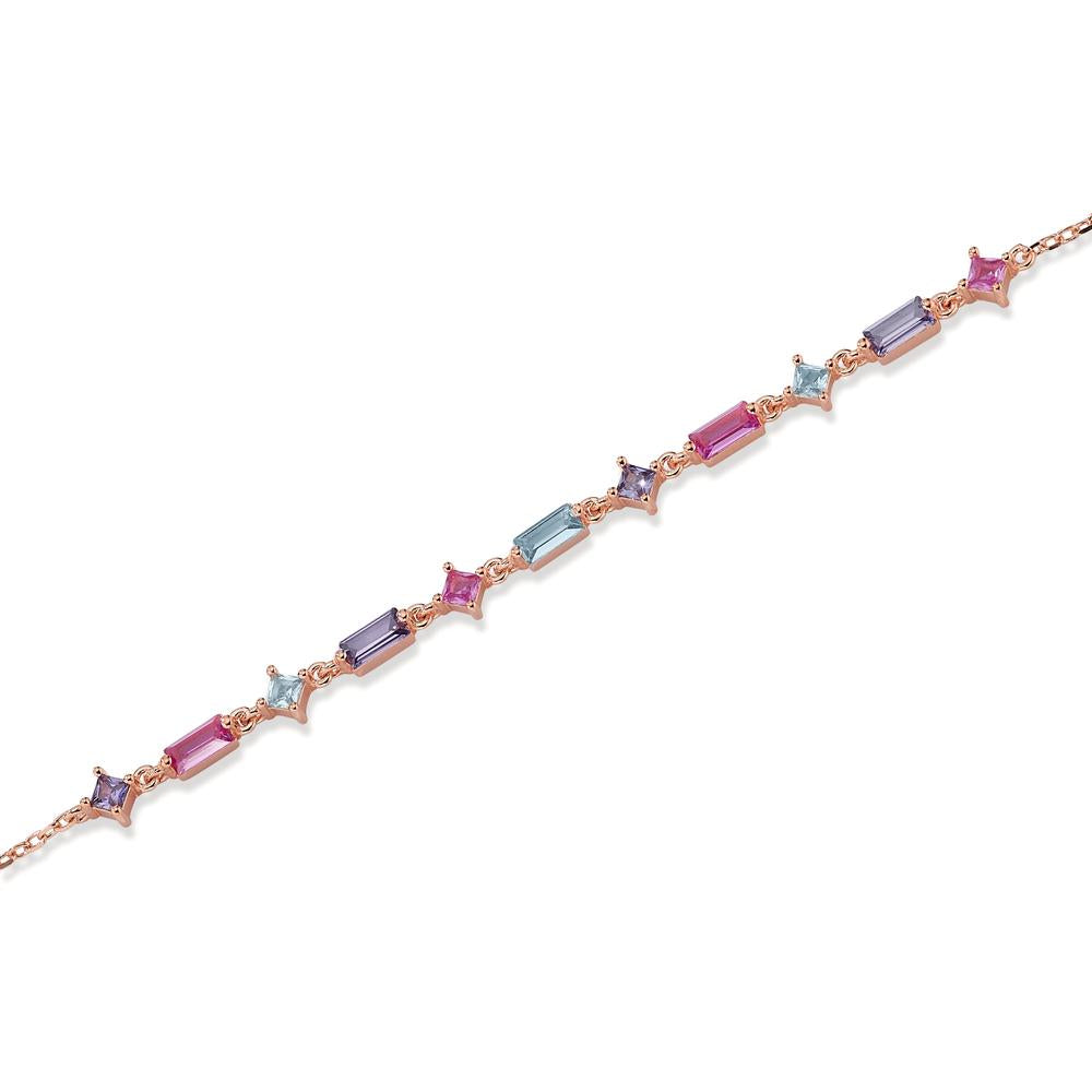Elegant women's bracelet crafted from sterling silver with a rose gold finish, adorned with sparkling cubic zirconia stones in vibrant pink, purple, and blue hues. Adjustable chain ensures a perfect fit for any wrist, adding a touch of color and sophistication to every outfit.