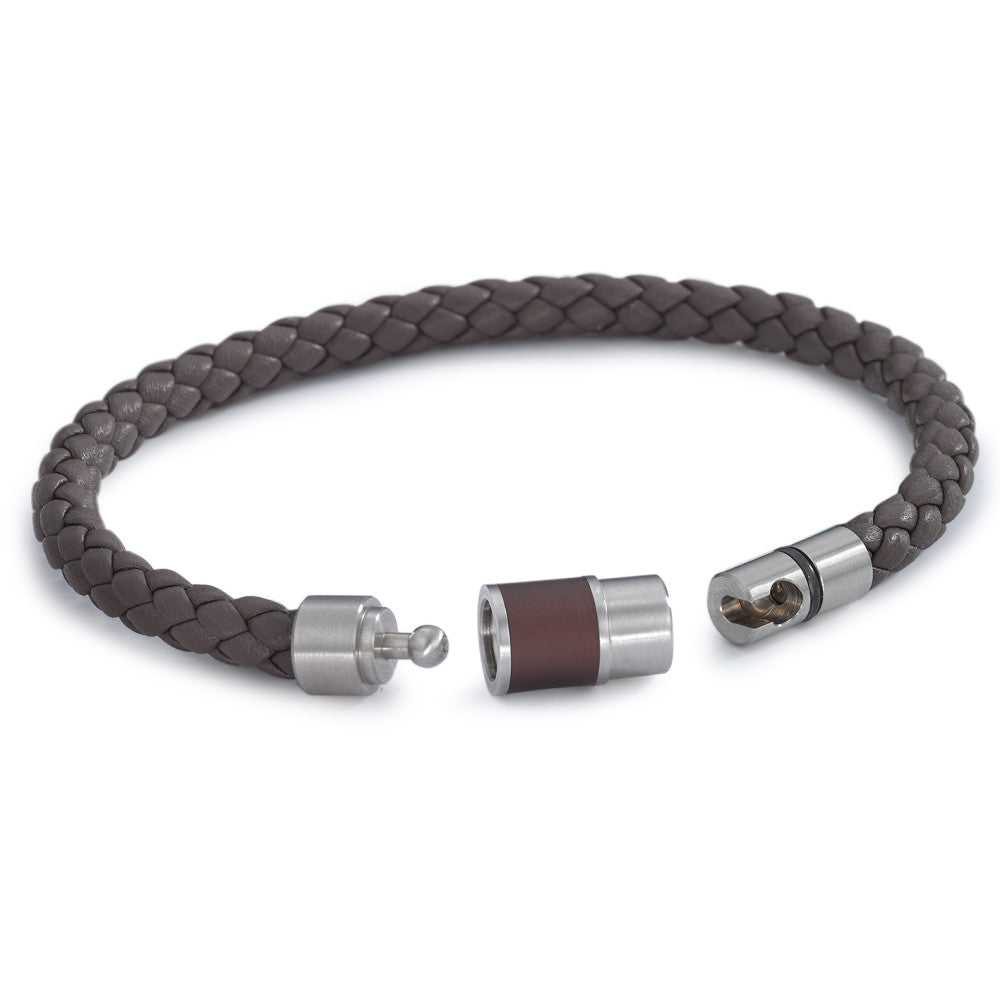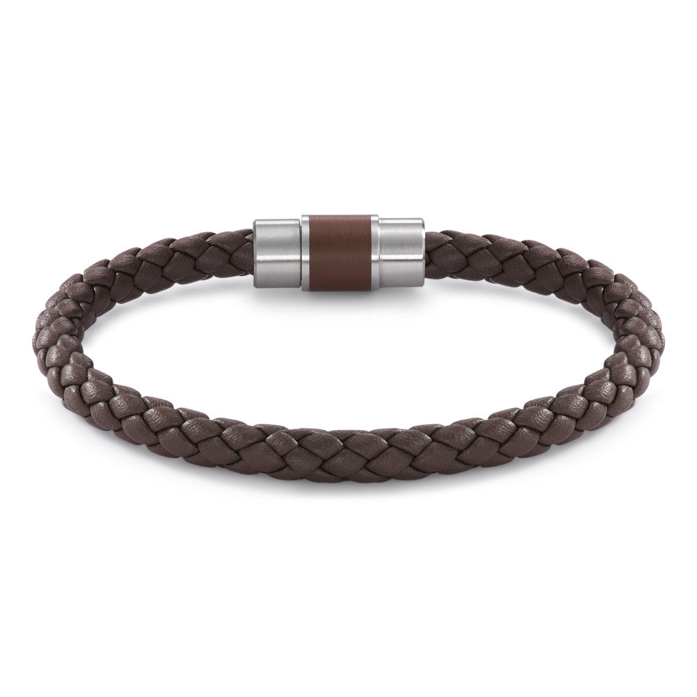 This men's bracelet combines braided brown leather with sleek stainless steel and ceramic accents for a modern, sophisticated look. Perfect for everyday wear, its durable materials ensure style and comfort all day long. A versatile accessory for any outfit.