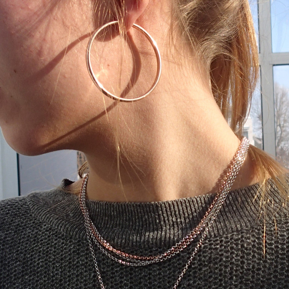 Elegant women's hoop earrings in silver with a radiant rose gold finish. These classic creole earrings feature a smooth, polished surface that adds a timeless touch to any outfit. Lightweight and perfect for everyday wear or special occasions.
