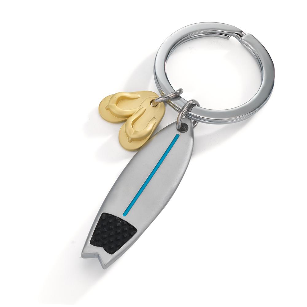 Stylish metal keychain featuring a surfboard and flip-flop charms, perfect for beach lovers. Durable and lightweight, it adds a fun, coastal vibe to your keys or bag. A great gift or personal accessory to keep your essentials easy to find with a touch of summer spirit.