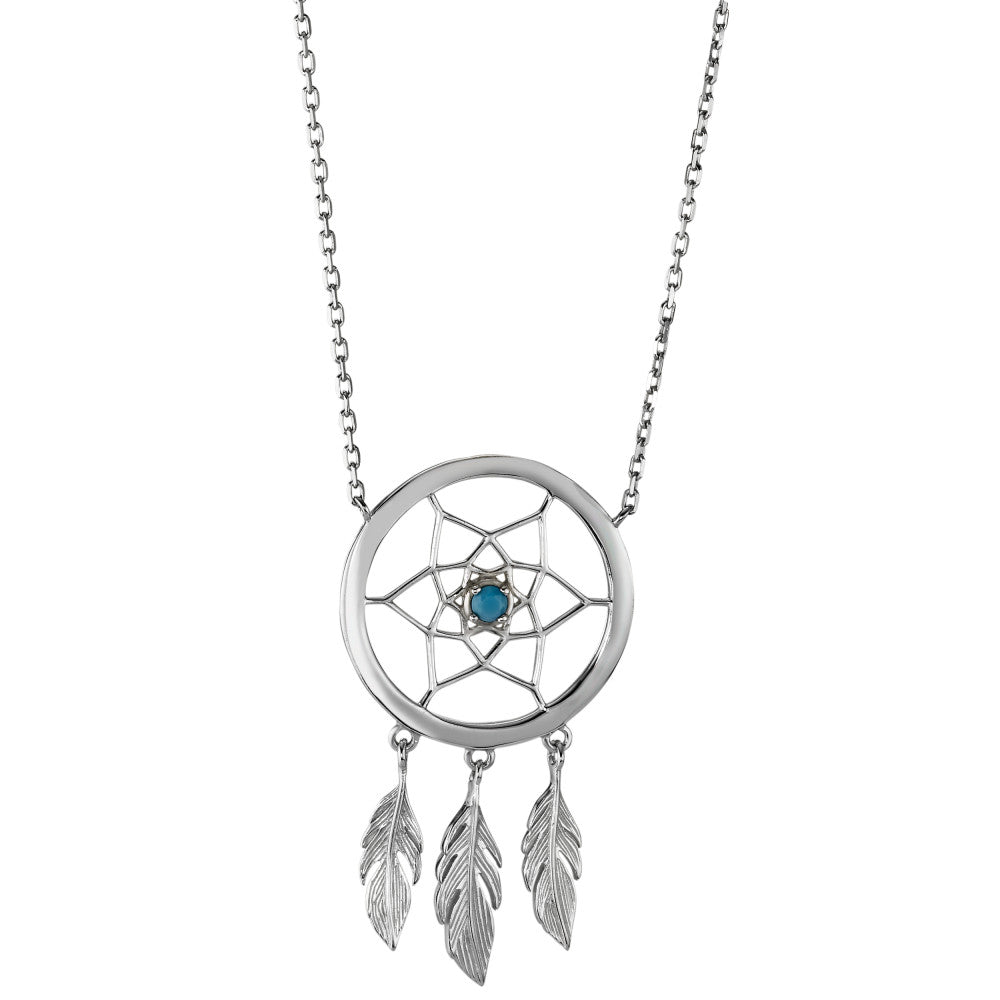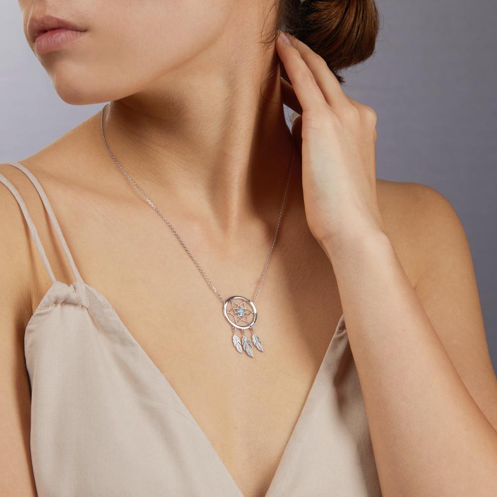 Elegant women's necklace crafted in silver, featuring a delicate dreamcatcher pendant. The center is adorned with a synthetic stone, adding a subtle pop of color. A perfect blend of modern style and symbolic charm, ideal for everyday wear or special occasions.