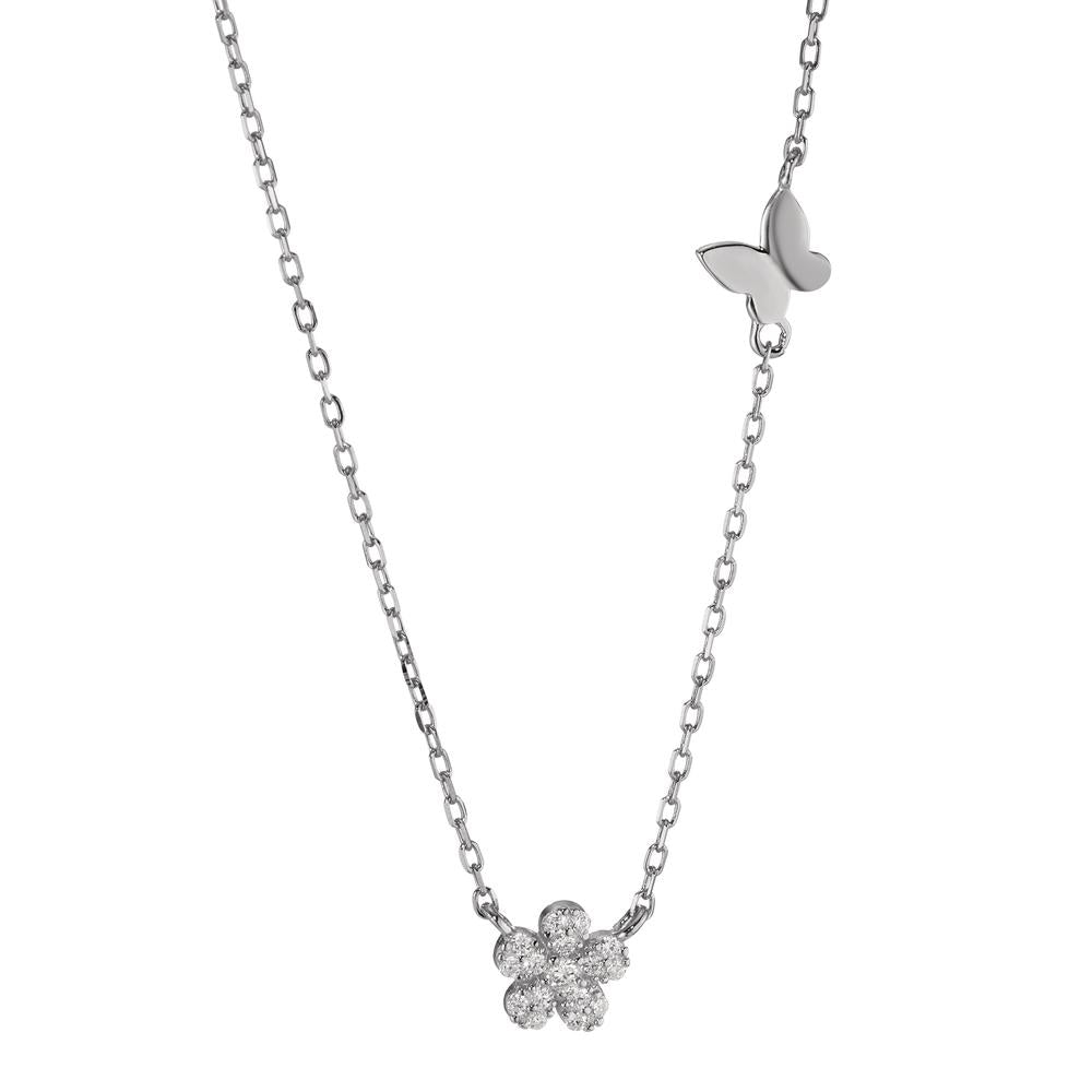 Delicate women's necklace crafted from shimmering silver, featuring a charming flower pendant adorned with sparkling zirconia stones. Enhanced by a subtle butterfly detail on the chain, this elegant piece adds a touch of nature-inspired beauty to any outfit. Perfect for everyday wear or special occasions.
