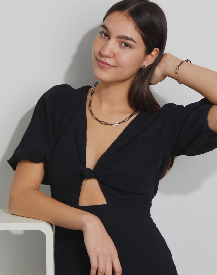 This women's necklace features a striking design crafted from durable stainless steel and carbon. Its unique combination of materials creates a modern, elegant look perfect for any occasion. Lightweight yet sturdy, it adds a stylish edge to your jewelry collection.