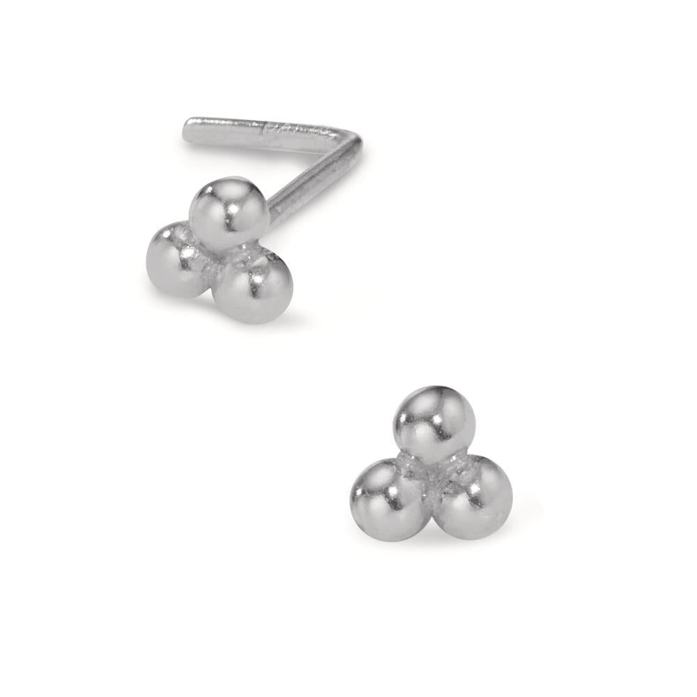 Elegant women's nose stud crafted from 18K white gold (750). Featuring a delicate design with three small polished spheres, this nose pin offers a subtle yet stylish accent. Perfect for everyday wear or special occasions, it combines comfort and timeless elegance.