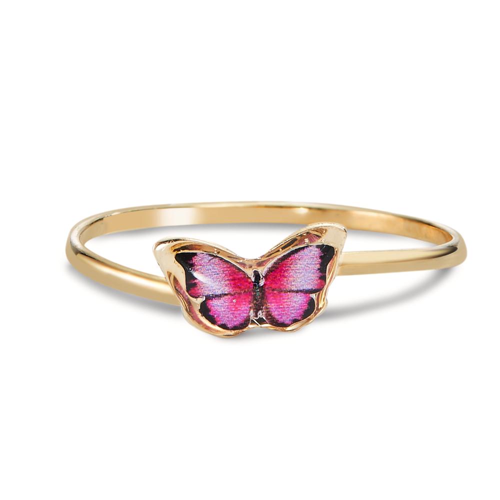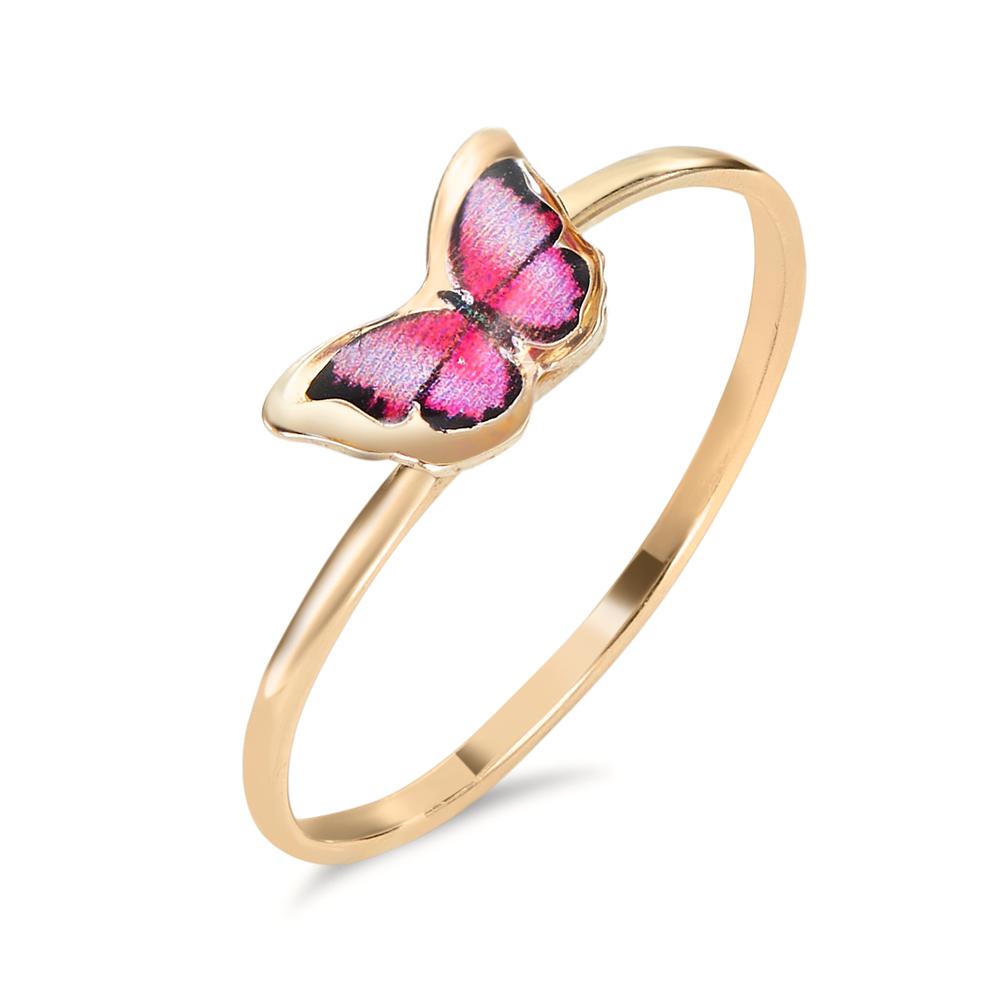 This delicate girls' ring is crafted from 375 yellow gold and features a charming pink butterfly motif. Its slender band and vibrant butterfly design make it a perfect accessory for everyday wear or special occasions, adding a touch of playful elegance to any outfit.