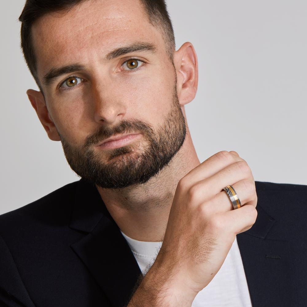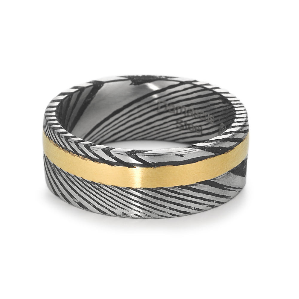 Men's ring crafted from Damascus steel, featuring a distinctive pattern and a striking gold stripe. This bold and stylish accessory combines traditional craftsmanship with modern design, perfect for those seeking a unique and durable statement piece.
