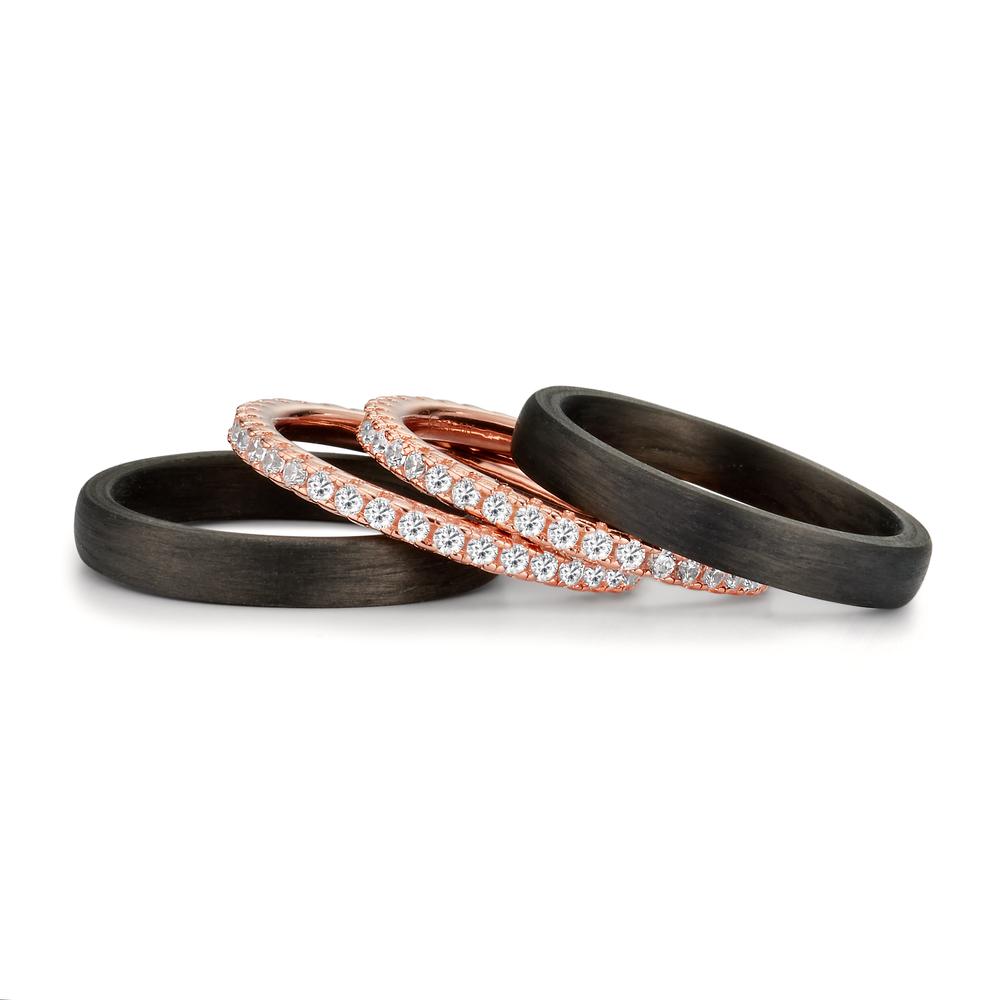 This women's ring set features a unique combination of elegant rose gold and black material. Adorned with sparkling cubic zirconia stones, it offers a modern, sophisticated look perfect for any occasion. Stylish, durable, and eye-catching, a must-have addition to your jewelry collection.