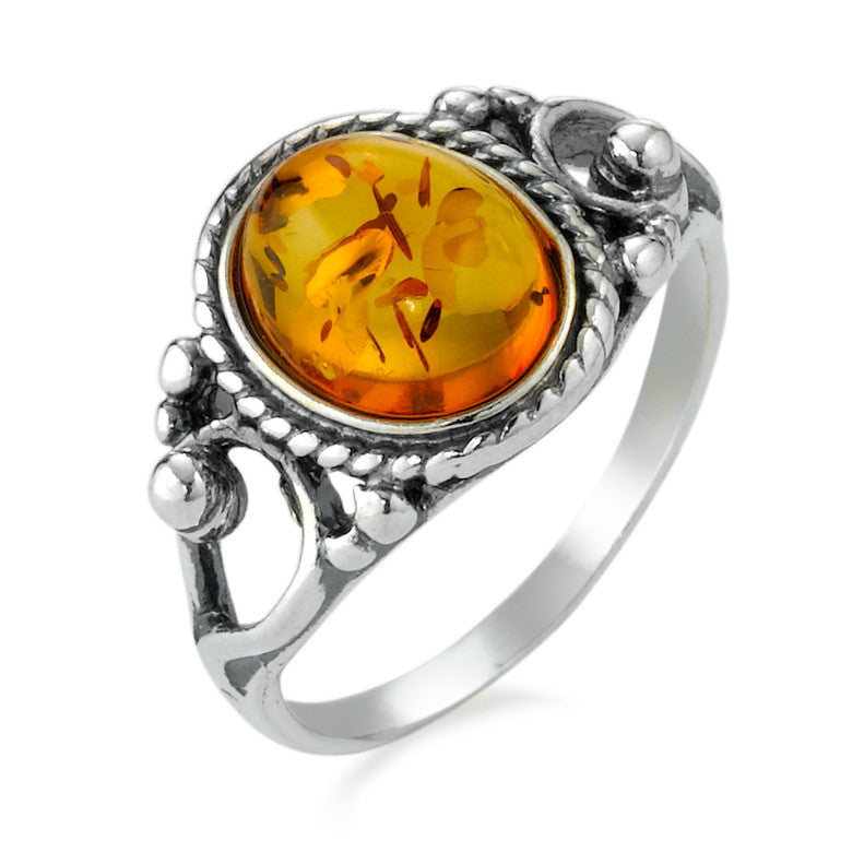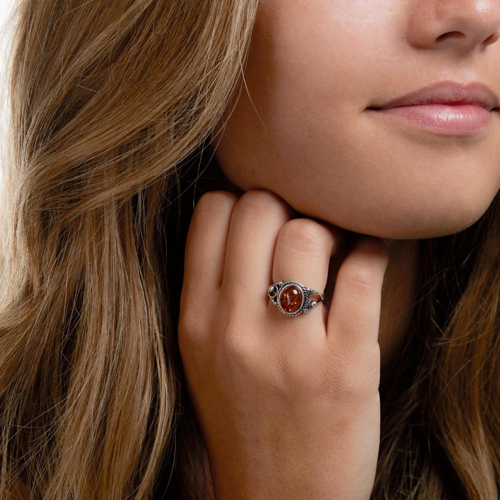 Elegant women's ring crafted from sterling silver, featuring a stunning amber gemstone. The warm, honey-toned amber is beautifully set in an intricately detailed silver band, combining classic charm with timeless style. Perfect for everyday wear or special occasions.