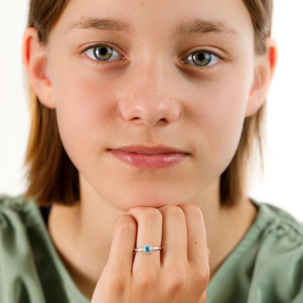 This charming girls' ring features a sleek silver band adorned with a sparkling blue crystal centerpiece. Delicately surrounded by silver bead details, it combines elegance and youthful style, making it a perfect accessory for any occasion.