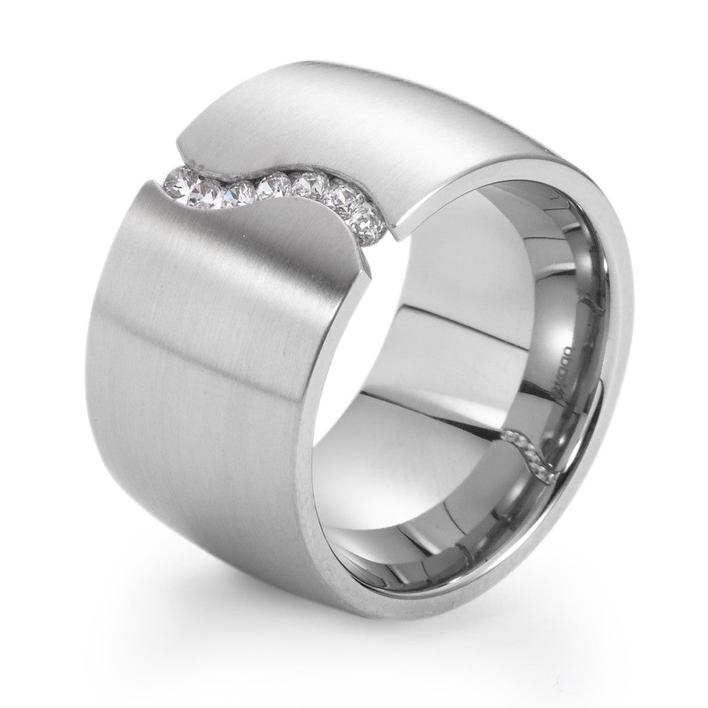 This elegant women's ring is crafted from durable stainless steel with a matte finish. It features a unique design with a wave-like cut adorned with sparkling zirconia stones, adding a touch of sophistication to any outfit. Perfect for everyday wear or special occasions.