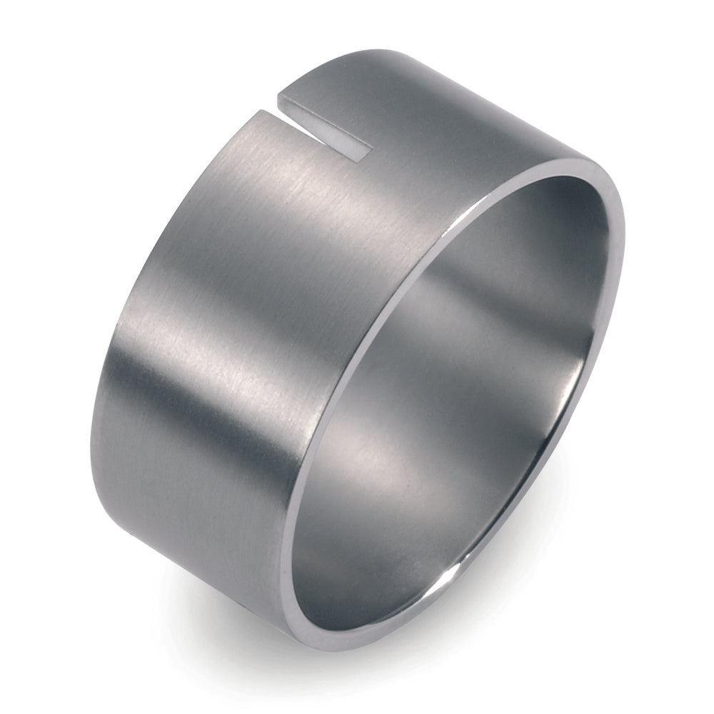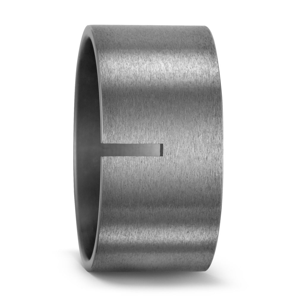 This sleek men's ring is crafted from durable titanium, featuring a modern brushed finish. Its unique design with a subtle cut-out detail offers a bold yet minimalist look. Lightweight and hypoallergenic, it’s perfect for everyday wear or special occasions.