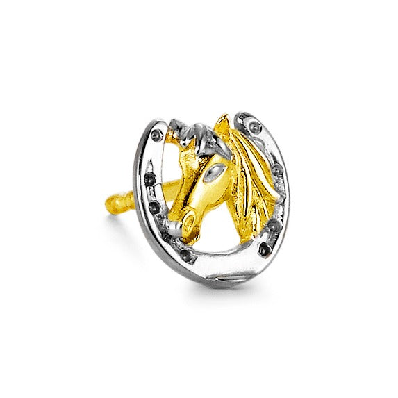 Men's single stud earring crafted from 18K yellow gold, featuring a detailed horse head design encased in a silver-tone horseshoe. A stylish and unique accessory perfect for horse lovers seeking a bold yet elegant statement piece. Durable with high-quality craftsmanship.