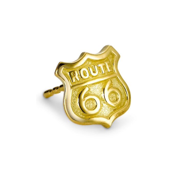 Men's single stud earring crafted from 18K yellow gold, featuring the iconic Route 66 shield design. This stylish accessory combines classic charm with a touch of American road trip spirit, perfect for adding a bold statement to any look. Durable and timeless.