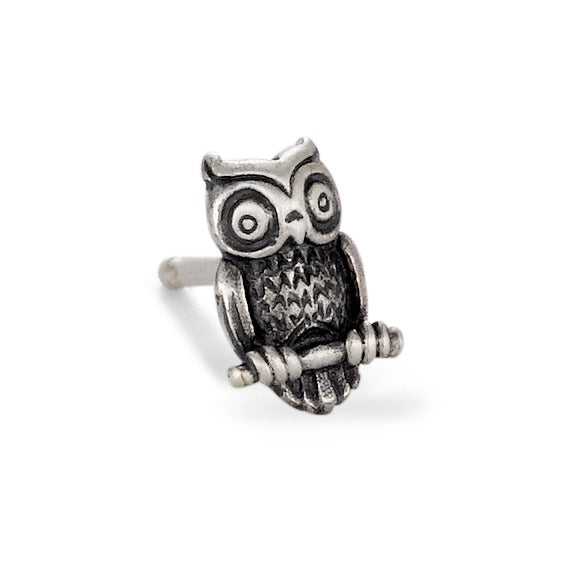 Men's silver owl stud earring, single piece. Crafted with intricate details, this stylish accessory adds a unique touch to any outfit. Perfect for those who appreciate subtle yet distinctive jewelry with a nature-inspired design. Durable and comfortable for everyday wear.