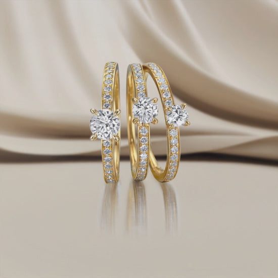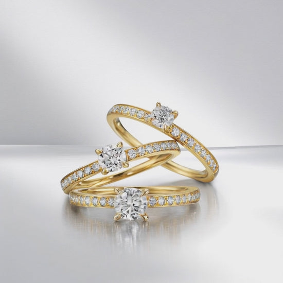 Elegant women's solitaire ring crafted from 18K yellow gold (750). Features a stunning central diamond complemented by smaller diamonds along the band, creating timeless sparkle and sophistication. Perfect for special occasions or as a luxurious everyday accessory.