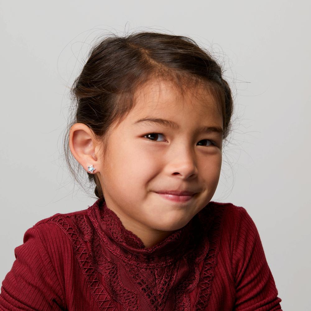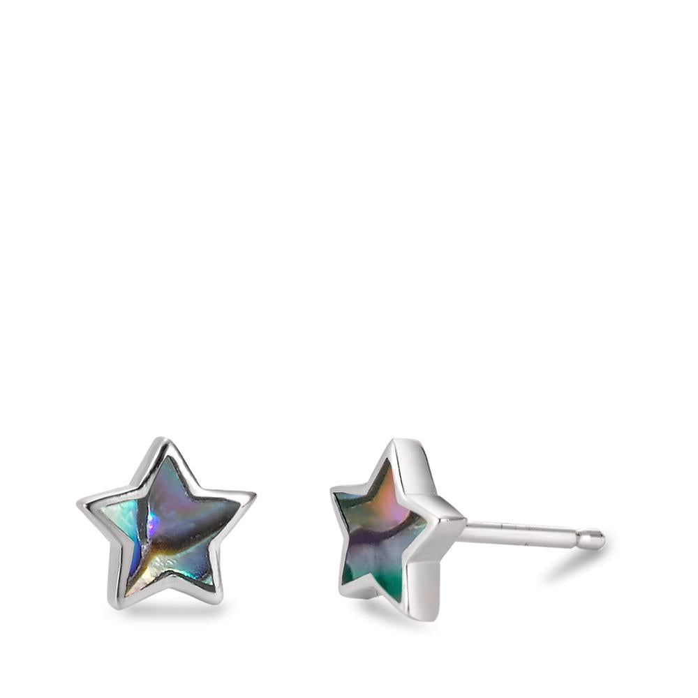 These charming girls' stud earrings feature a star-shaped design crafted from sterling silver, inlaid with shimmering abalone shell. Lightweight and hypoallergenic, they add a delightful touch of iridescent sparkle, perfect for everyday wear or special occasions.