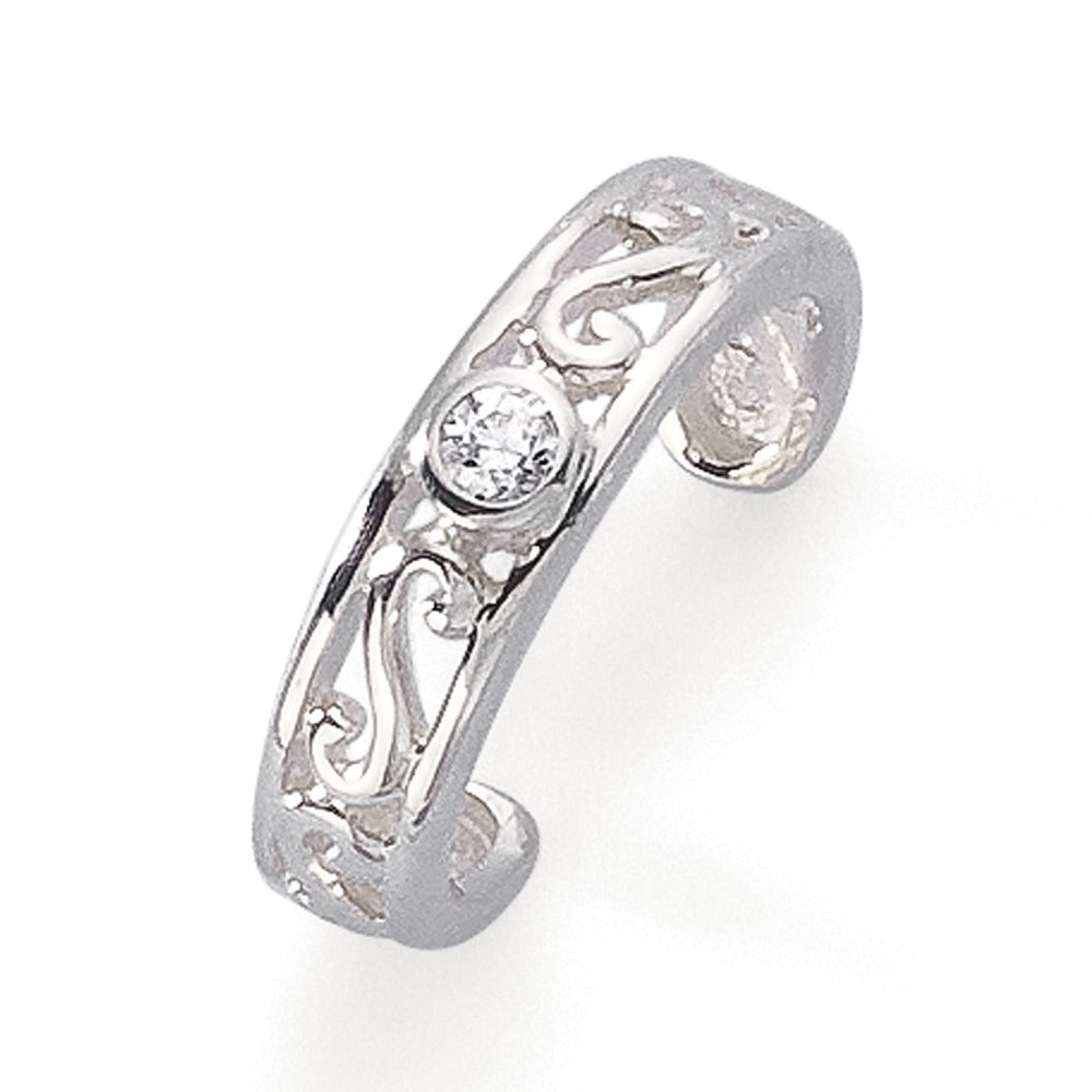 Elegant women's toe ring crafted from silver, featuring a delicate filigree design and a sparkling zirconia stone for a touch of brilliance. This adjustable piece combines comfort and style, perfect for enhancing your summer look with subtle sophistication.