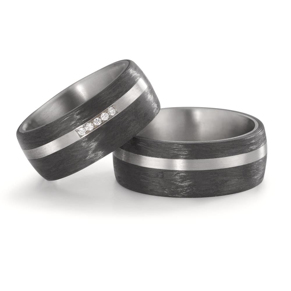 This women's partner ring combines modern elegance with durability. Crafted from lightweight titanium and carbon, it features a sleek metallic stripe adorned with five sparkling diamonds. A perfect symbol of commitment, blending strength and refined beauty in one unique design.